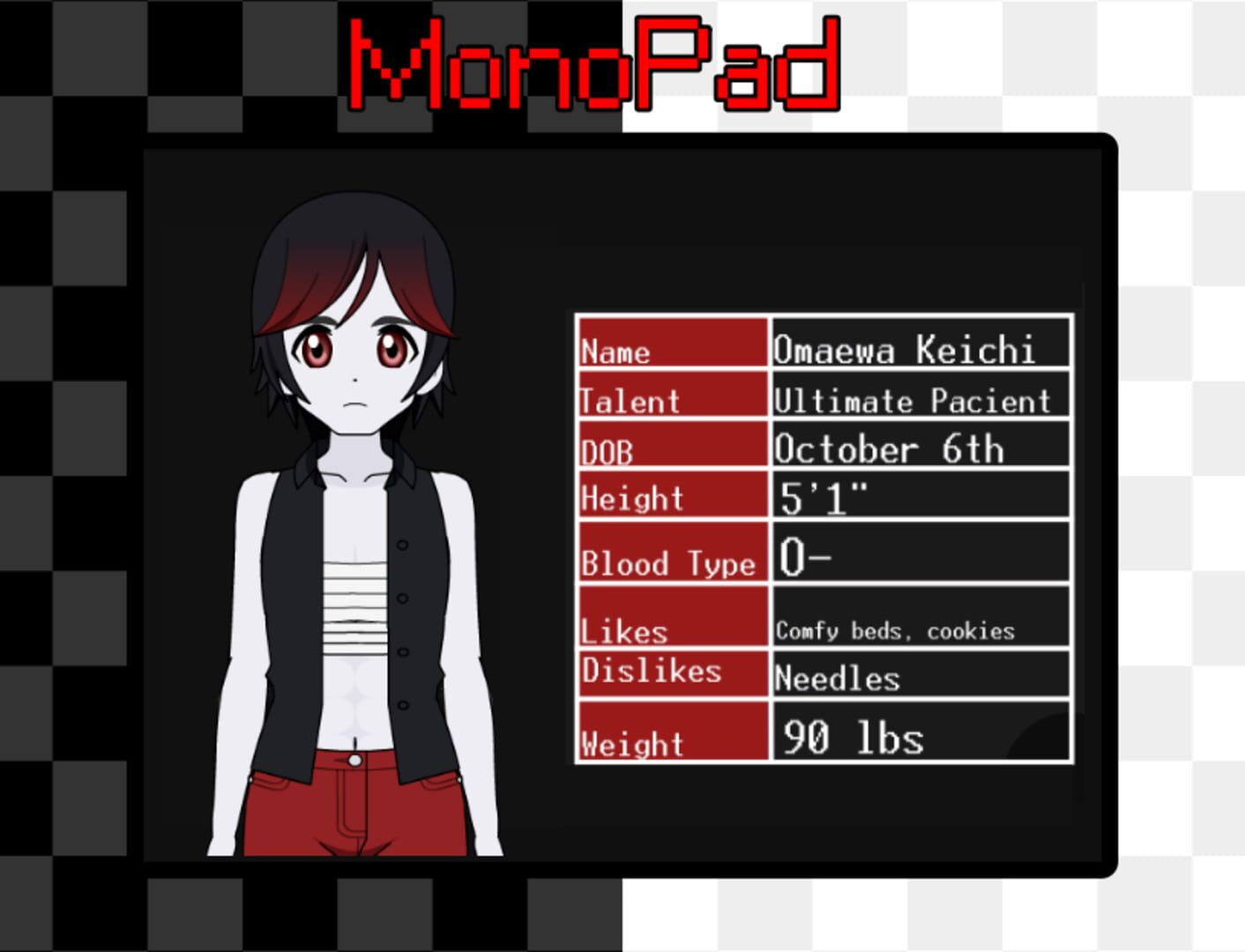 A Danganronpa fangame that is set in a hospital. 15 students are trapped in a hospital with a psychotic bear named Monokuma, the only way to get out is by getting away with murder. This fangame was completed up to chapter 4 daily life, and has since been cancelled.