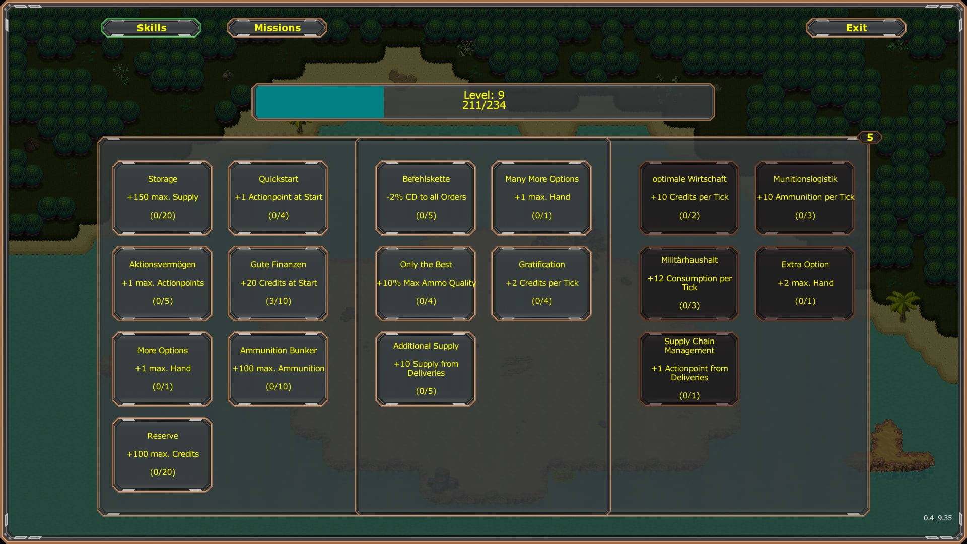 With each level-up, you gain a skill point to invest in passive bonuses—such as higher starting resources, larger hand size, or better resource rates. This adds a growing meta-progression system that deepens your playstyle alongside your deck choices.