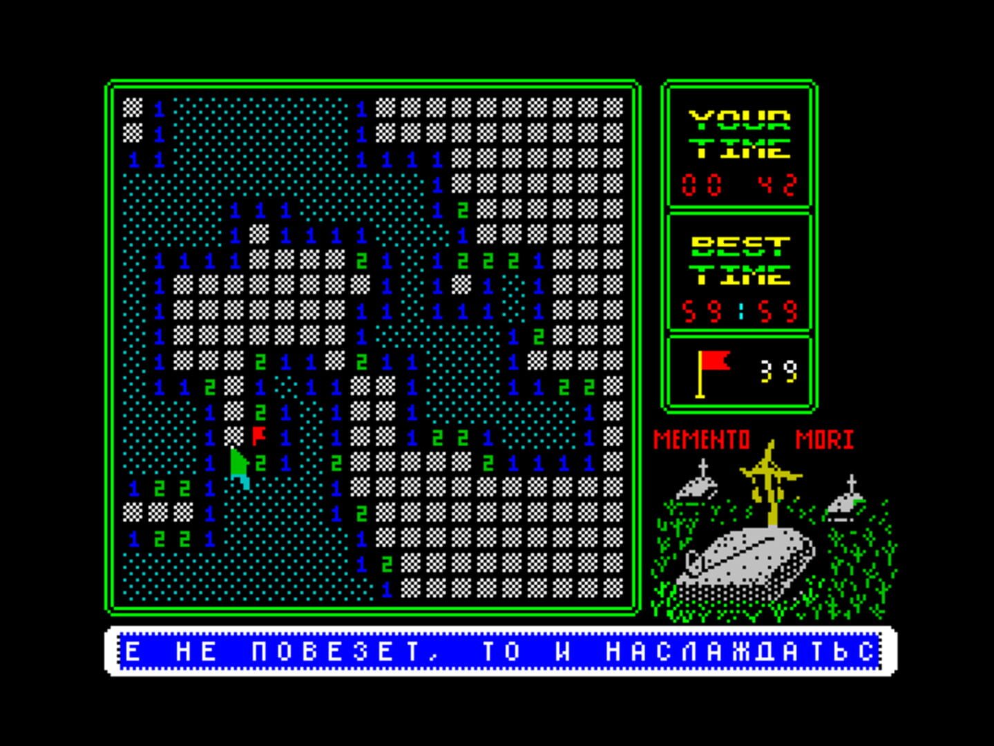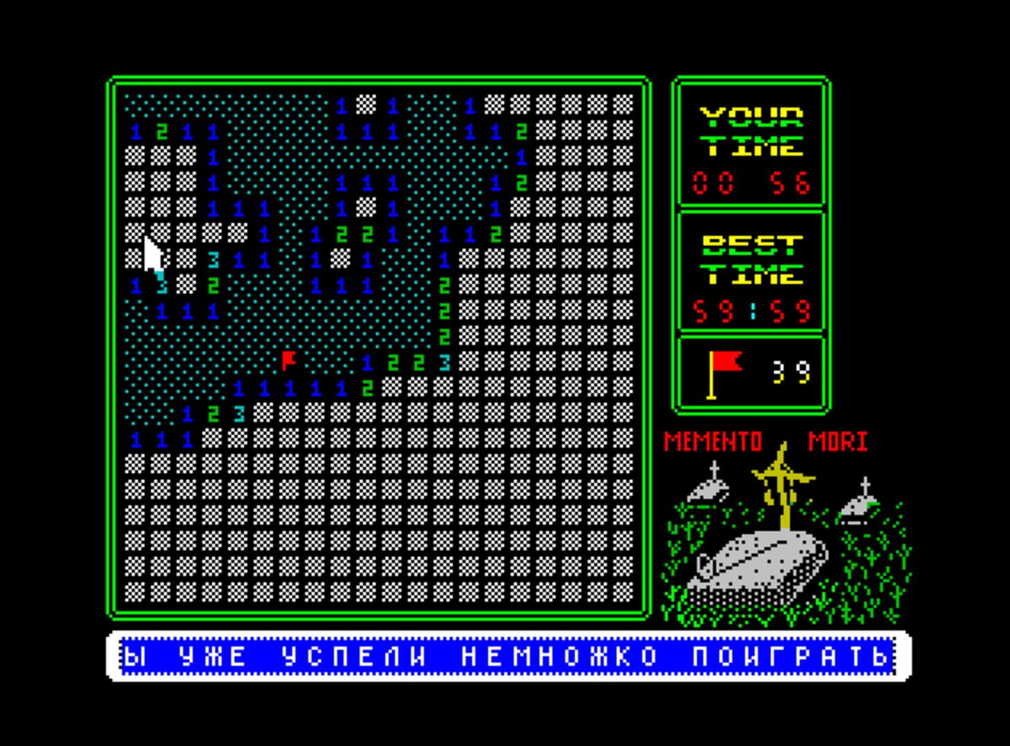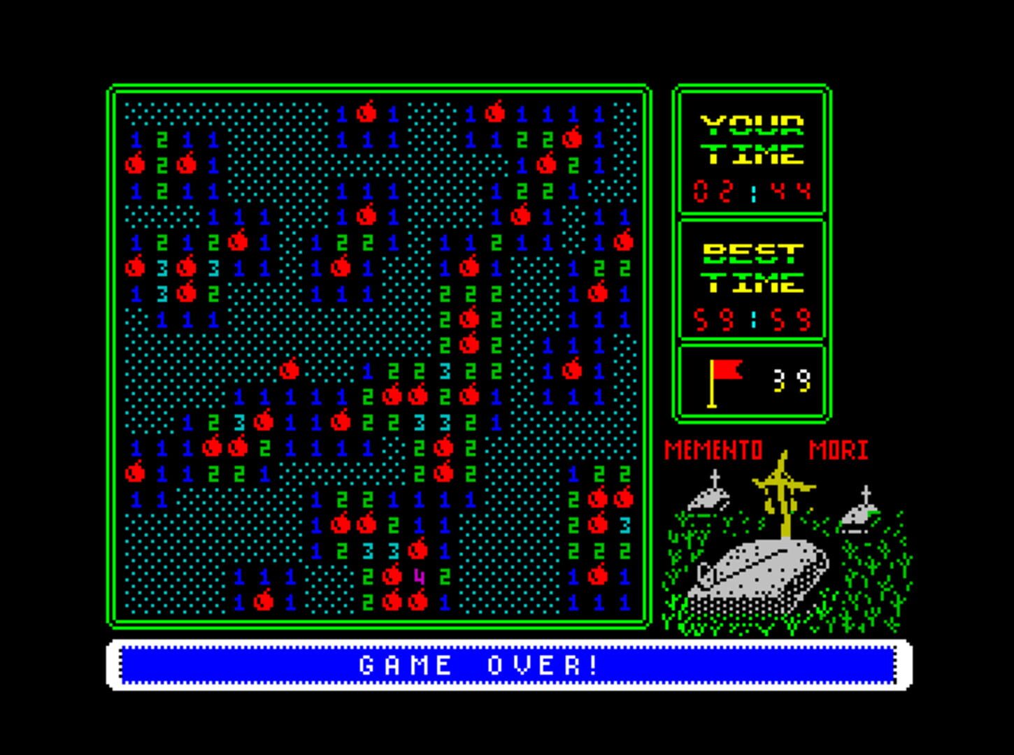 On a grid, the player clicks in a cell and hopes that it is not occupied with a mine. If it isn’t, that cell is filled with a number, which indicates how many mines there are in adjacent cells. Using logical thinking, looking at the relations between different number cells, the player can conclude which cells contain a mine and mark them as such. Once all cells are revealed, the player progresses to the next minefield.