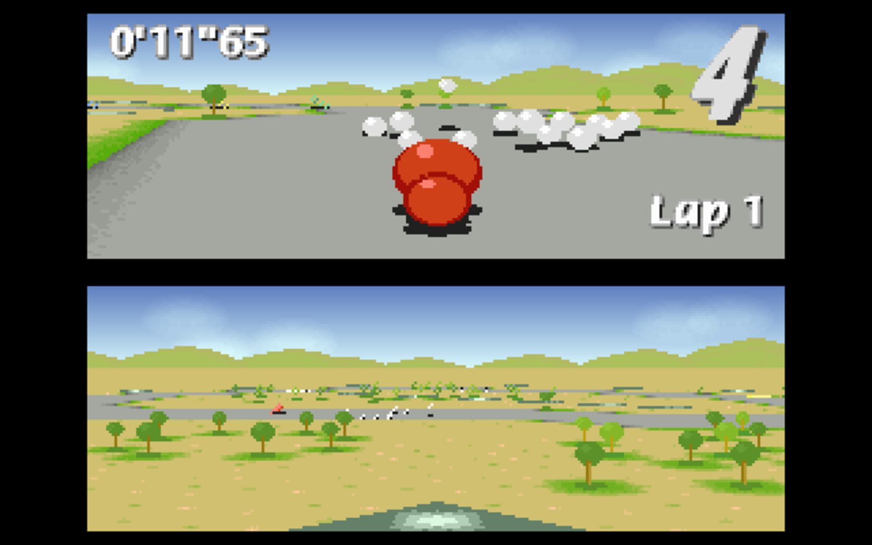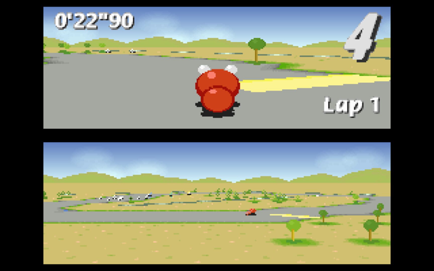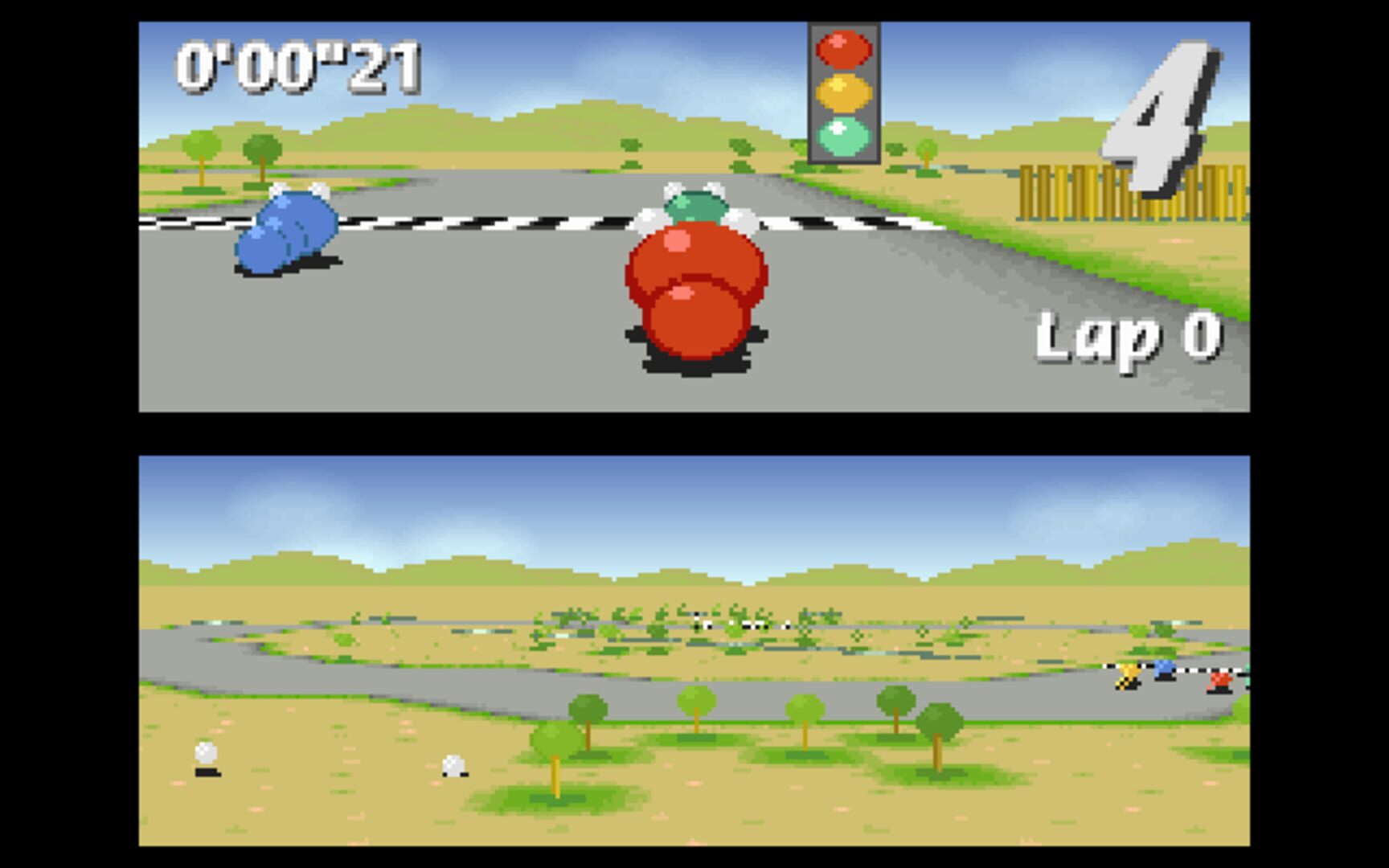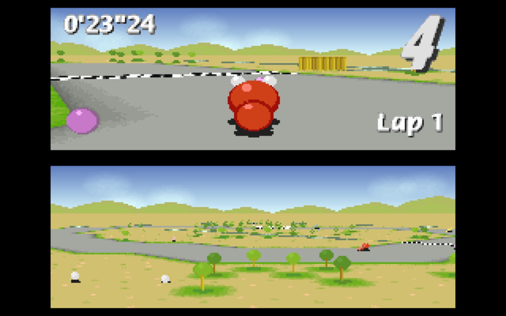 Similar to older kart racing games, the game features a pseudo-3D view made up of flat sprites.